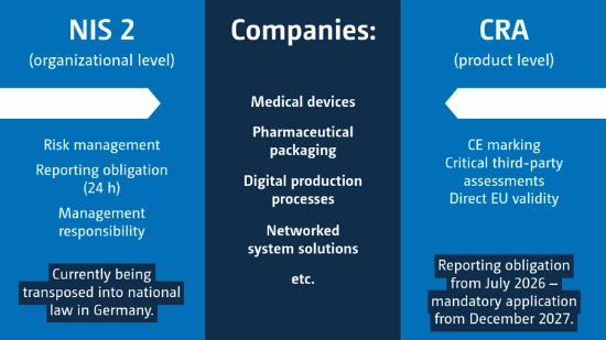 The full scope of the regulation only becomes apparent when NIS 2 and CRA are considered together. While NIS 2 places responsibility on the organization, CRA focuses directly on the product. For pharmaceutical packaging solutions, this means that digital components, software, interfaces and networked systems are becoming more of a regulatory focus. Cybersecurity becomes part of product compliance, quality requirements and long-term operational safety.